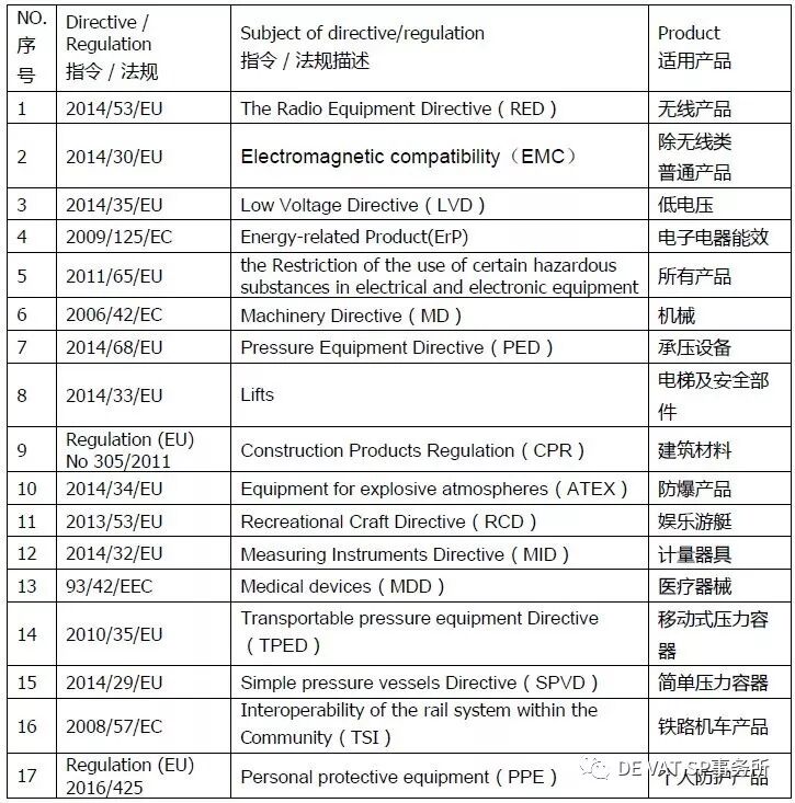 CE指令是一个大的体系,其主要组成部分是指令或者法规,不同的产品需要符合的指令或者法规是不一样的,当一个产品同时受多个指令覆盖时,该产品只有在全部符合有关指令的规定后,才能加贴CE标志,常见CE指令见下表~